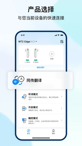 3. 操作简单:单耳使用可分享,靠近手机自动连接选模式交流;双耳使用设置主从机模式实现同步翻译播放;耳机支持触控操作,自动模式下自动判断发言进行翻译。