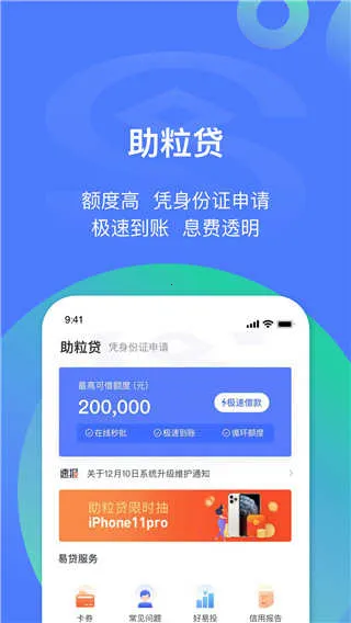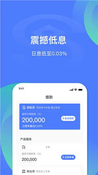 1. 操作极简,3步完成借款申请,最快10分钟资金直达银行卡,全程线上化,无需抵押担保,凭身份证即可在线授信,额度最高20万元。