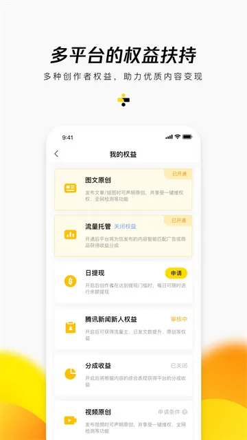 4. **多平台分发**:内容可同步分发至腾讯新闻、QQ看点、看点快报、腾讯视频、微信新闻插件、手机QQ新闻插件等多个亿级流量入口,最大化扩大影响力。