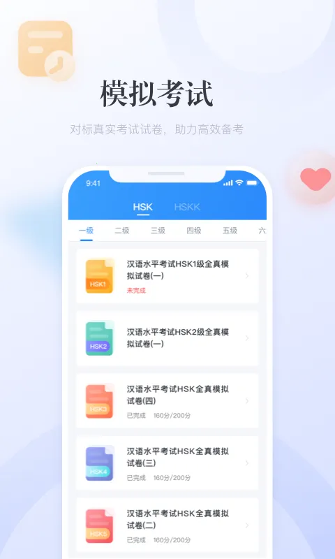 4. 100套HSK全真模拟试卷,严格遵循各等级考试题型、难度与时间设置,支持限时作答、自动批改与错因分析,还原真实考场体验。