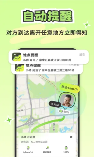 3. 对方上车下车离开或到达任意地方时,自动发送报备消息,免去彼此担忧。