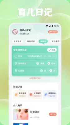2、能便捷记录宝宝辅食、睡眠、换尿布等日常细节。
