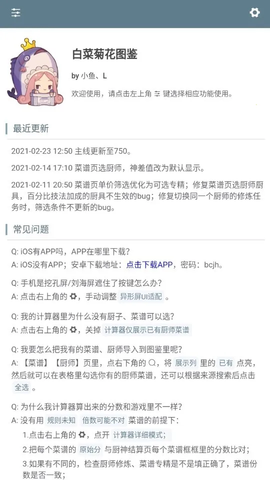 白菜菊花计算器2026官方最新版本是游戏辅助工具,有详尽图鉴系统。周五厨神大赛可匹配最佳阵容,能查贵客需求。还具备多种实用功能及亮点,有常见问题解答,助玩家高效游戏。