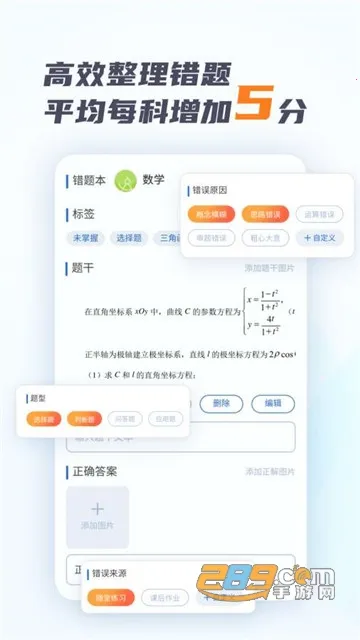 1、智能归纳整理,通过智能归纳与科学整理,结合拍照识别与分类技术,帮助用户轻松制作专属错题本,实现错题快速录入与高效归纳,还能借助云计算与大数据分析,挖掘与分析错题数据。