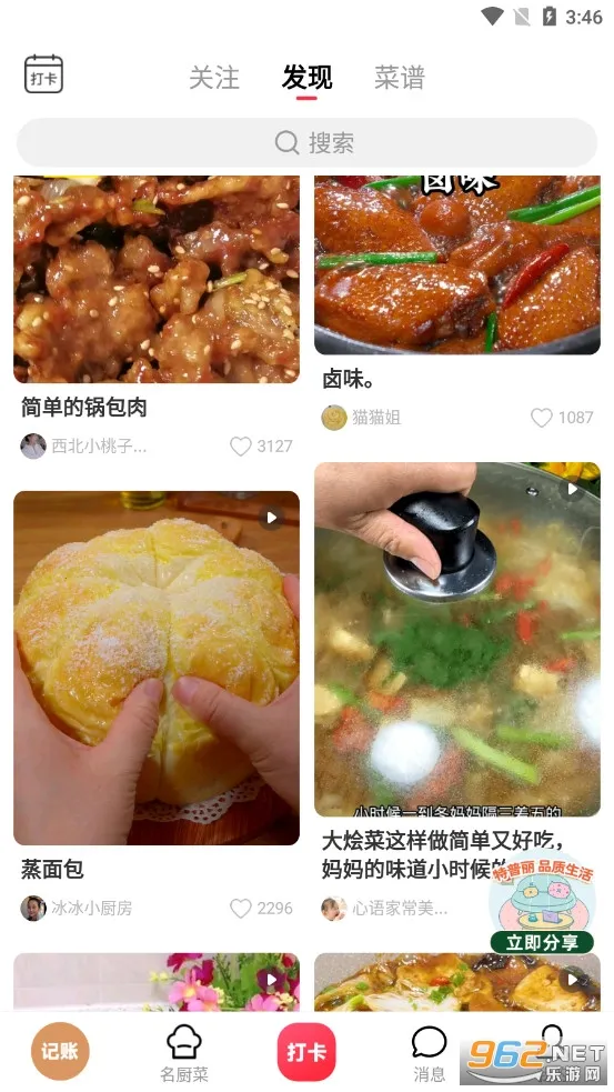 2、分享互动强:软件加入了分享功能,用户能快速分享喜欢的食谱、相关过程。社区互动平台活跃,用户可发布原创菜谱,参与活动赢奖励,形成美食交流生态。