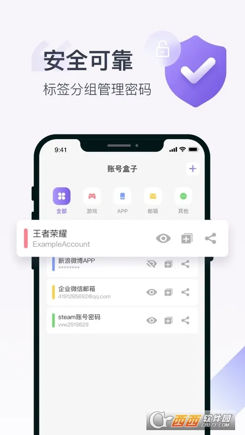 账号盒子2025官方正版是一款账号管理工具,能记所有账户密码并确保安全,有云端存储、多维管理等功能,可分类整理账户信息,保护隐私,一键锁定号码、快速改密,操作方便。