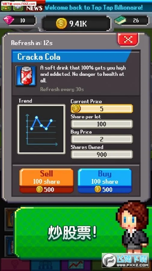 点点亿万富翁是一款超好玩的休闲放置类手游。它能让你体验亿万富翁的人生,过足老板瘾。游戏采用经典像素画风,玩法趣味十足。开局通过点击屏幕积累初始资金,之后可雇佣交易员自动买卖商品,遵循低买高卖原则,轻松实现离线收益。随着公司发展,能升级办公环境,购买装饰品个性化商业帝国。后期可解雇表现不佳的员工提升效率,利用股票系统投资炒卖。这里有众多必选人物,比如卡特琳娜,投资成功率增加10;蛇女,点击获得金币增加500;爱因斯坦,书本赚取率加100等。他们能在不同方面助力你赚钱,让你更轻松地构建商业体系、优化管理、扩大资产,最终成为真正的亿万富翁,享受财富增长的乐趣,快来下载体验吧!