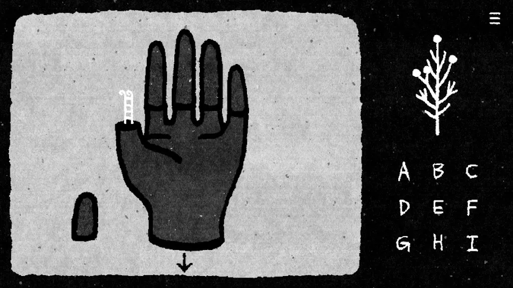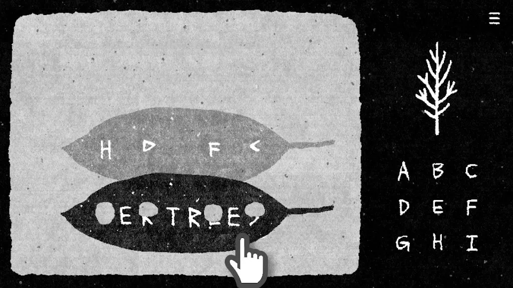 这款游戏营造出黑暗图画书般的氛围,有着梦境般神秘的世界观,还有与物体直接接触的感觉,艺术且独特的图形,搭配舒缓的环境声音。它完全非语言游戏,一切都是单色,不存在色盲无法解决的难题,也没有声音谜题。操作也很简单,点击关心的地方,有些东西滑动即可移动,输入右侧字母中的密码,点击树标记完成并重置,还能从右上角菜单查看提示、答案,保存自动进行,重置数据也能从菜单操作。能让你尽情享受解谜的乐趣,轻松沉浸在这场独特的逃脱之旅中。