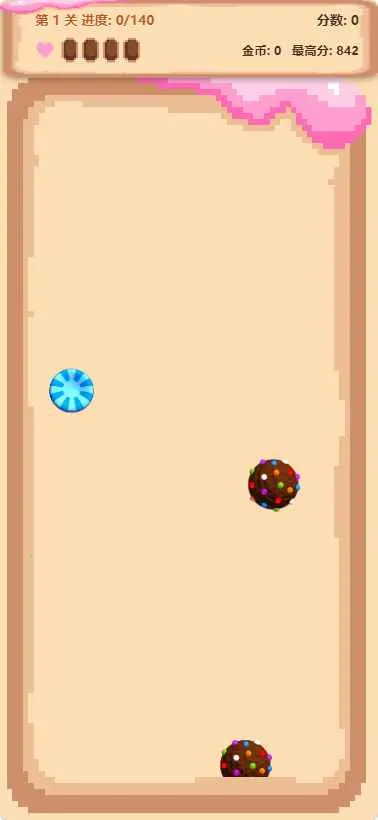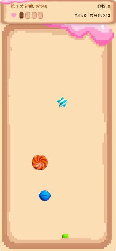 糖果碎碎乐是一款切割游戏,玩家在游戏区域划线挥刀切割糖果得分,切到炸弹扣生命,可用护盾抵消。达成目标分数通关获金币,能买道具。支持多种糖果,记录最高分与通关数,适合碎片时间玩。