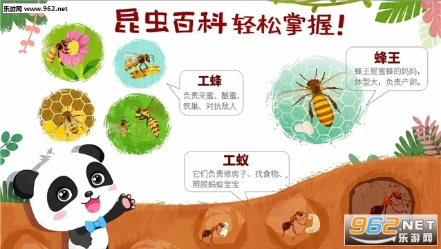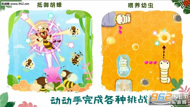 1. 游戏以Q萌昆虫形象吸引孩子,通过装扮蜜蜂女王、养幼虫、保卫蜂巢等趣味互动,让孩子边玩边学昆虫知识。